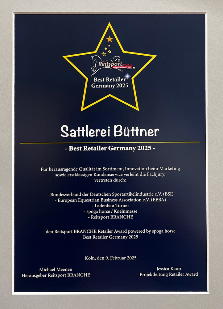 Dieser renommierte Award würdigt herausragende Fachgeschäfte, die durch exzellenten Service, ein erstklassiges Sortiment und eine besondere Kundennähe überzeugen. Schon die Nominierung unter die Top 10 der besten Reitsportgeschäfte Deutschlands (wie bereits 2022) war für uns eine riesige Auszeichnung – und nun den ersten Platz zu belegen, macht uns sprachlos vor Freude!