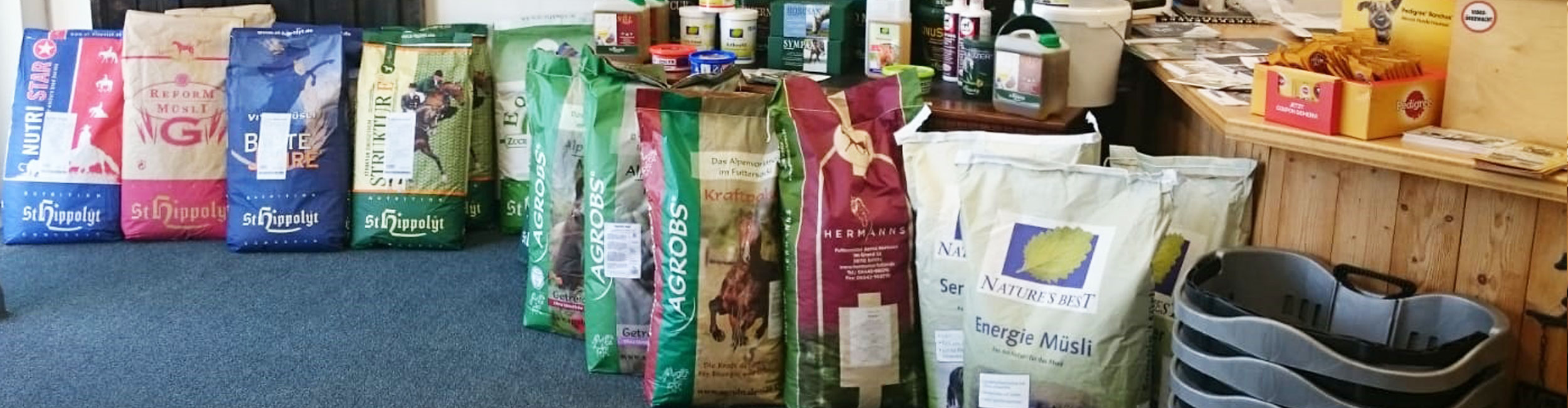 Neben hochwertigem Einstreu führen wir eine große Auswahl an Hauptfutter, Zuchtfutter und Futterzusatzmitteln in unserem Sortiment.